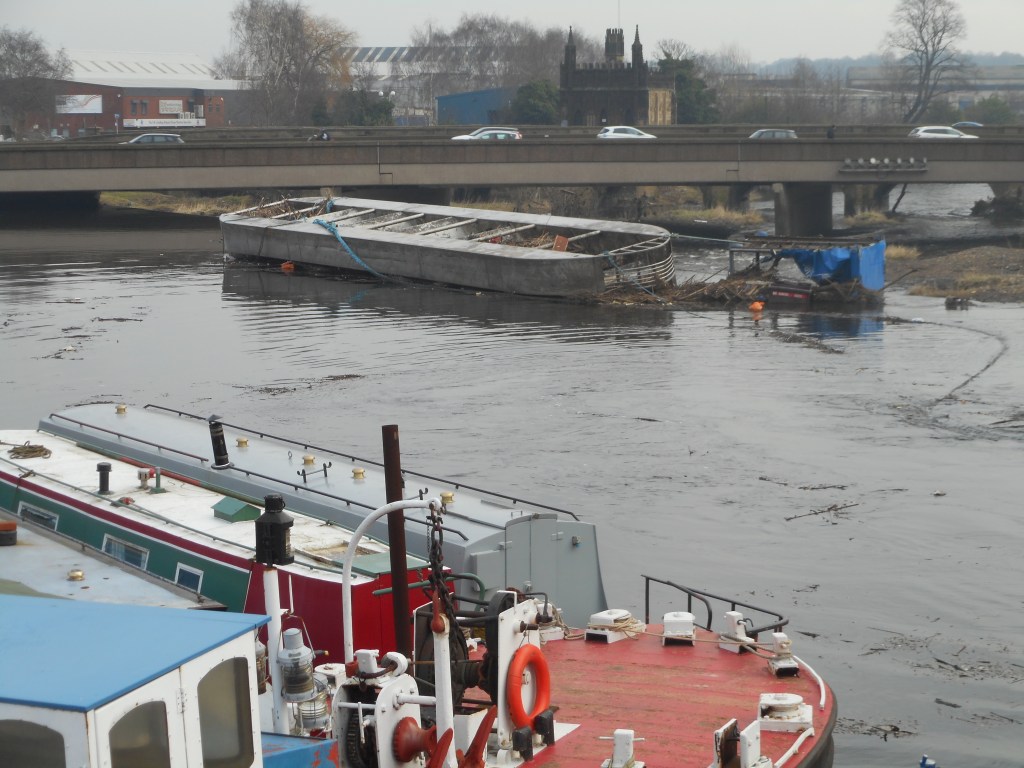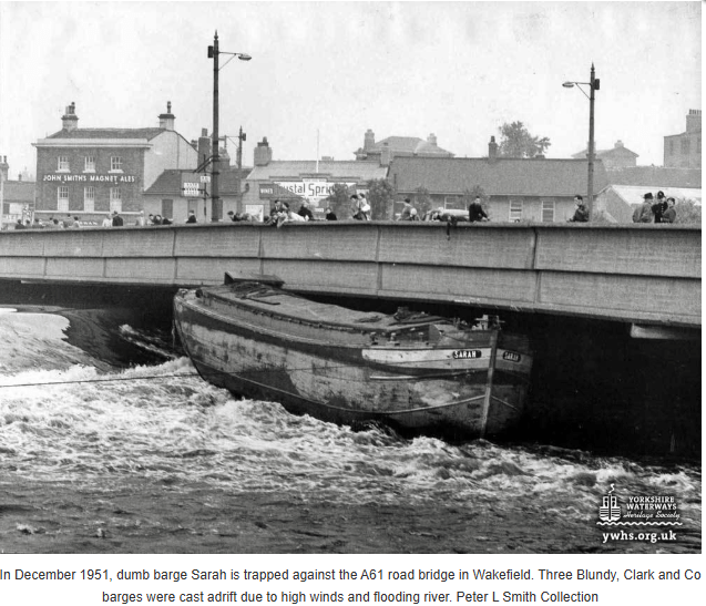 The power of the floodwater can be seen in the following photographs – the first dating from 1951 and the second from December 2015, both showing barges that had been swept away from the boatyard above Wakefield Bridge and become trapped either on the Weir or under the bridge itself.