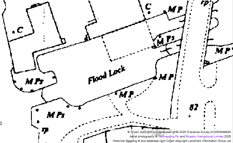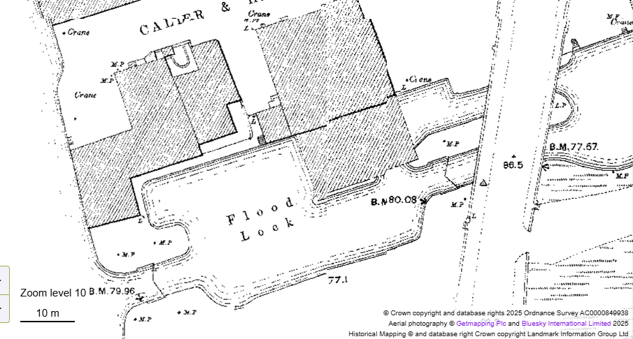 By 1890, the Aire & Calder Navigation Company had constructed a canopy across part of the Flood Lock to create a covered dock, supported by a stone column on the end of the island (still visible today) a sunken pilings in the centre of the flood lock, as shown on this map dating from 1891.