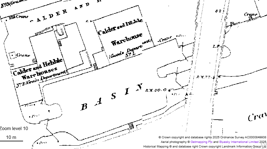 These images compare Wakefield in 1905 and 2025, showing the line of Fall Ings Cut belonging to the Calder & Hebble Navigation Company. which largely made redundant the old cut of the Aire & Calder Navigation to the north of the river, terminating at Wakefield Wharf, close to the Chantry Bridge. Note that Chantry Bridge was then known as Wakefield Bridge and was the only river crossing until the new Wakefield Bridge was opened in 1953.